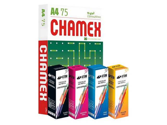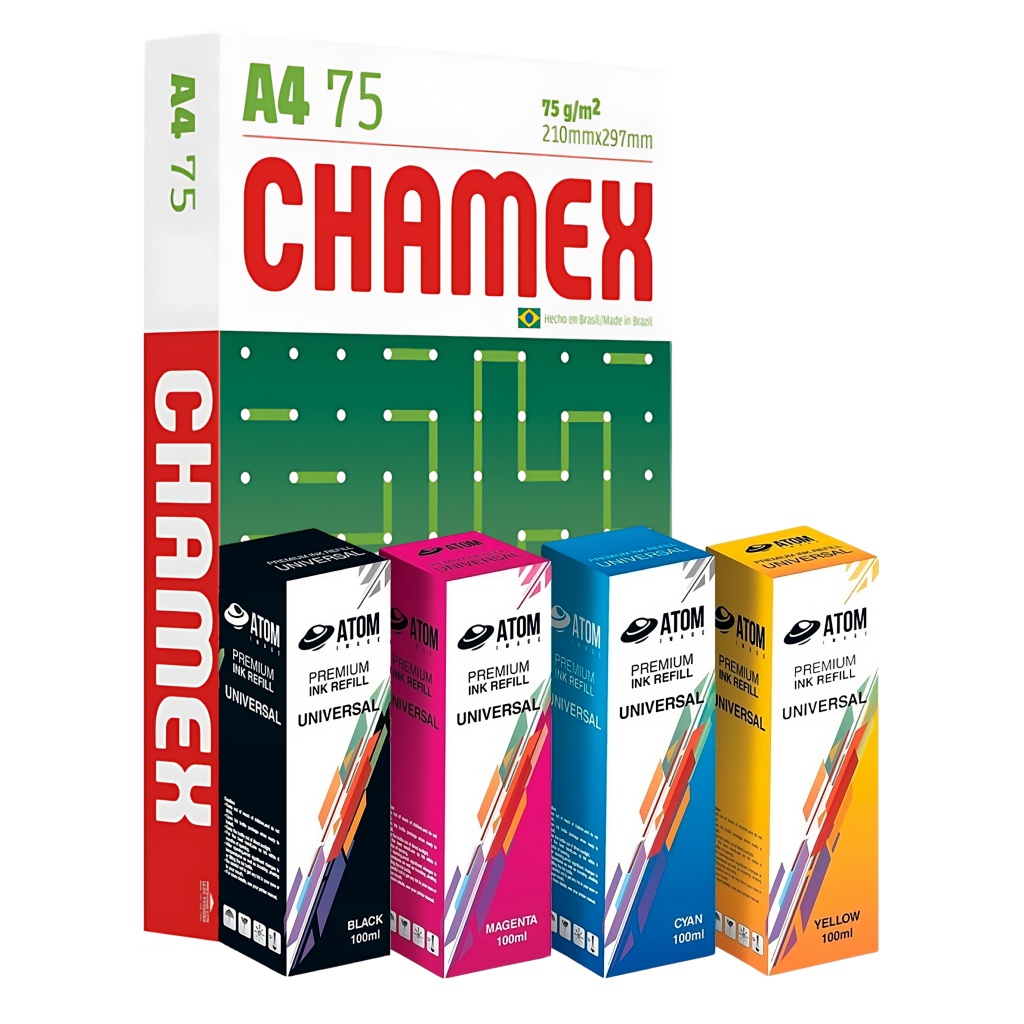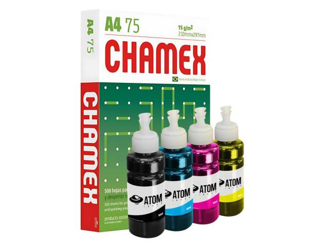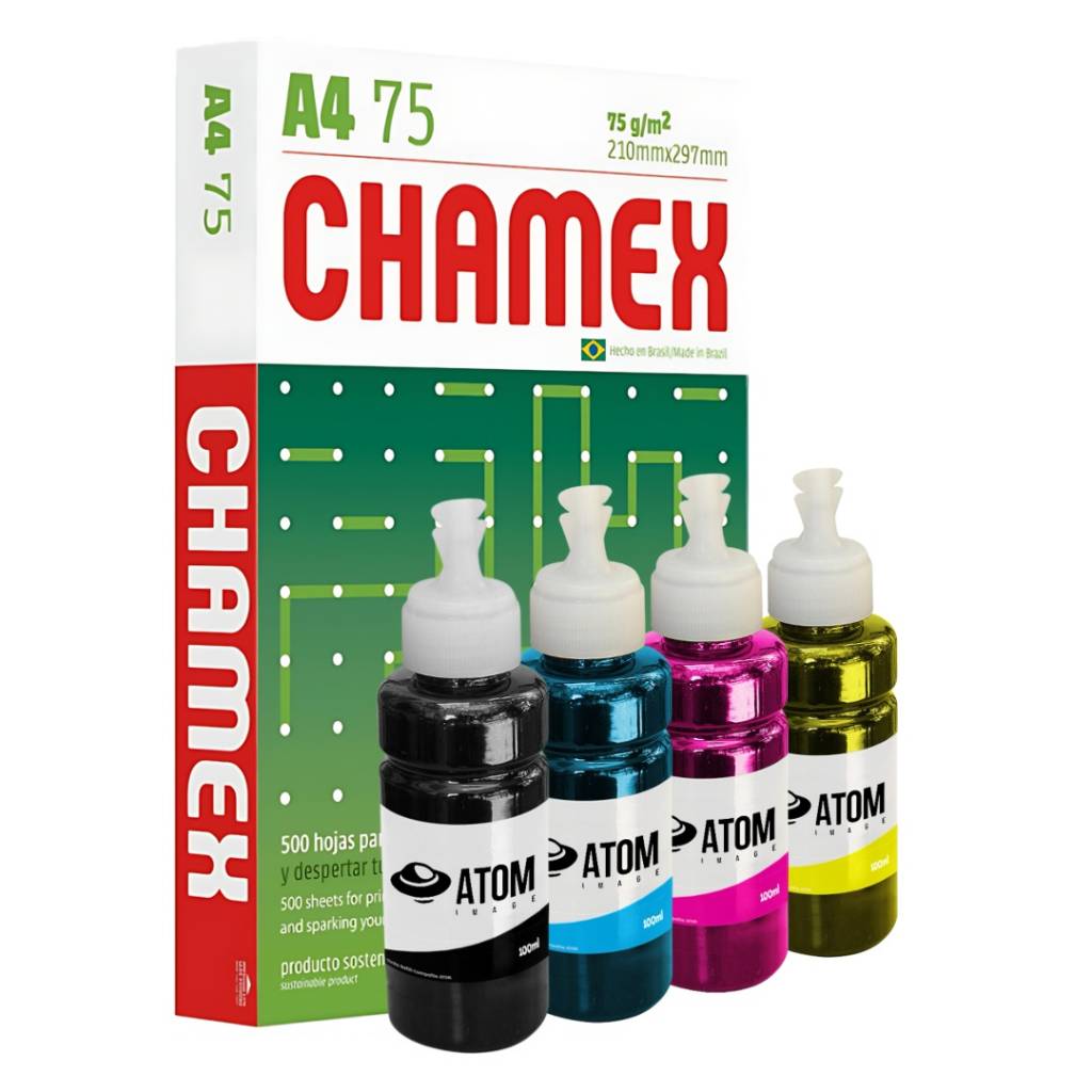 KIT 4 TINTAS REFILL COMPATIBLES ATOM + RESMA DE 500 HOJAS CHAMEX