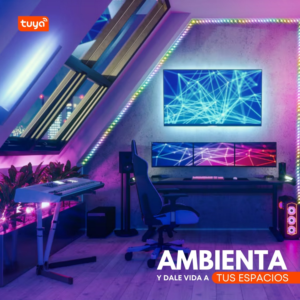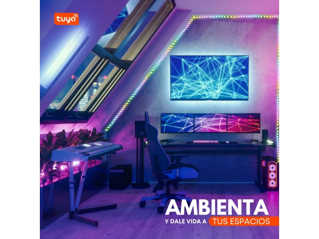 Nuestras guías LED transformarán cualquier espacio en un lienzo de colores vibrantes. Con un control remoto intuitivo y compatibilidad con las apps Tuya Smart y Smart Life, podrás configurar infinitas combinaciones de colores, ritmos, conexión con los sonidos del ambiente (función audiorítmica) y efectos visuales. Sumérgete en una experiencia de iluminación personalizada y controla todo desde la comodidad de tu smartphone o control incluido.