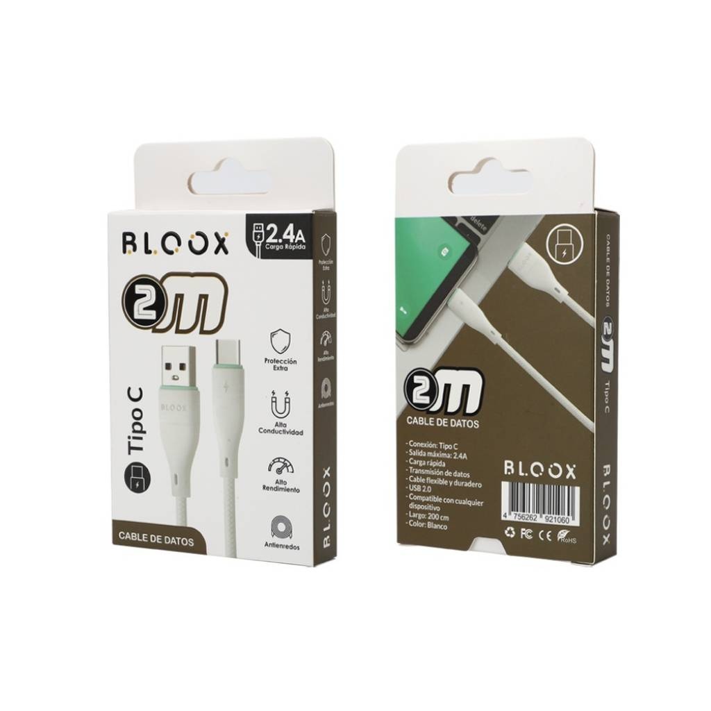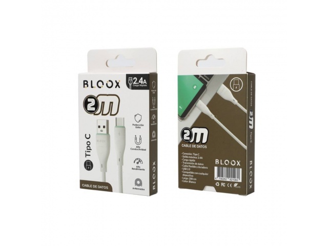 CABLE USB-A A USB-C 2MTS 2.4A PVC - BLOOX - BLANCO